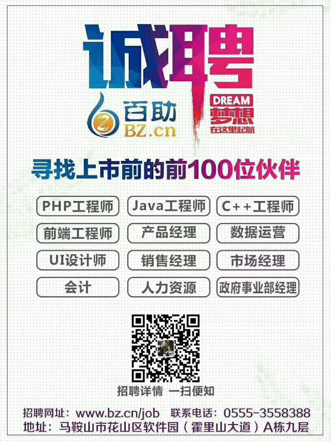 目前百助是马鞍山最有潜力的互联网公司,近期还荣获互联网百强称号,现仍有众多岗位空缺,欢迎大家踊跃加入。